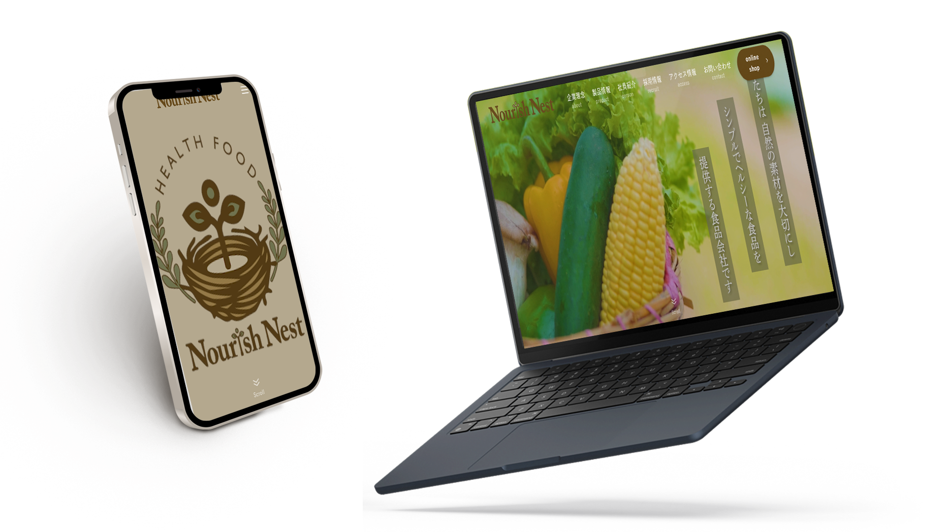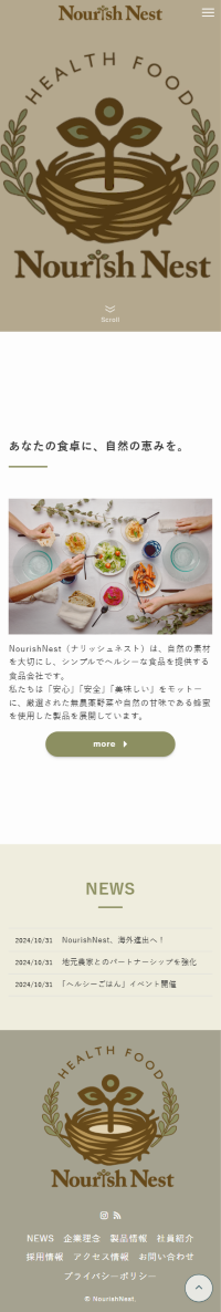 野菜ジャムを販売する「Nourish Nest」のオフィシャルサイトです。 全体として、自然な色合いと整然としたレイアウトが特徴的なサイトにし、企業の「安心」「自然」「健康」といったコンセプトを視覚的・内容的に表現しています。